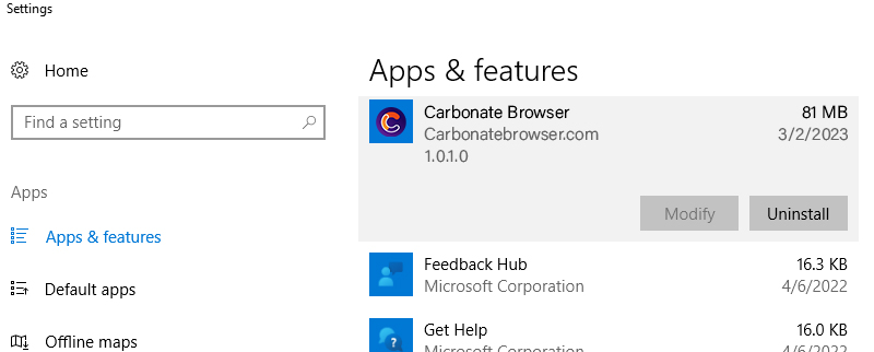 - Select “Uninstall” from the menu (represented by a stack of three dots) for Carbonate Browser located to the right of its file size.